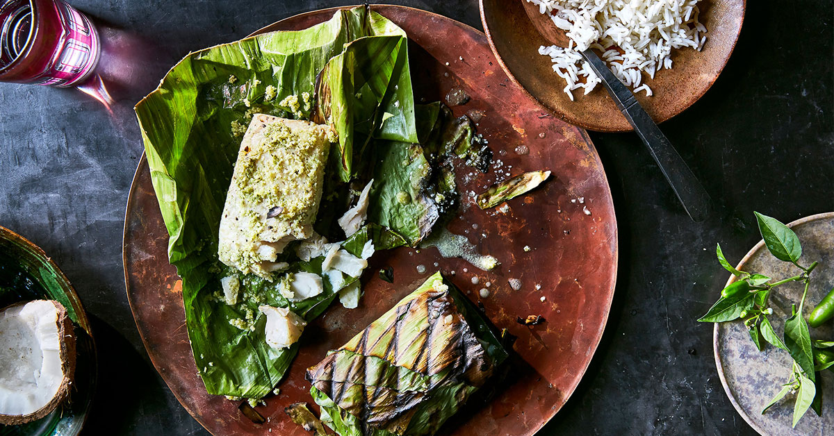 - Place the marinated fish on a banana leaf, adding green chilies and fresh coriander on top. Wrap the leaf securely around the fish.