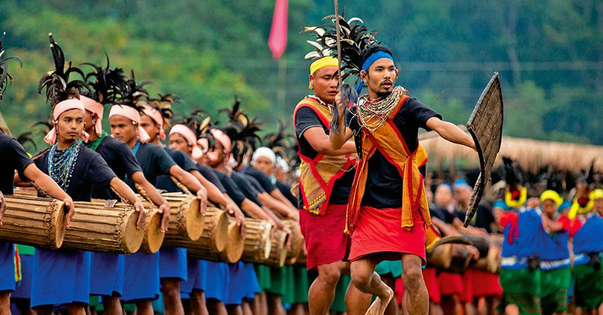 Significance: Wangala is a post-harvest festival celebrated by the Garo tribe of Nagaland in honor of "Misi Saljong," the sun god of fertility, to give thanks for a successful harvest. Observed on November 21st, the festival includes tradi- tional performances such as the Wangala dance and Rugala, along with indigenous games like Tug of War and stone lifting. Participants dress in vi- brant attire, accompanied by rhythmic drum music, feasts, and Chu (rice beer). Key rituals, such as the pouring of rice beer (Rugala) and the burning of incense, are conducted by the village priest to commence the festivities.